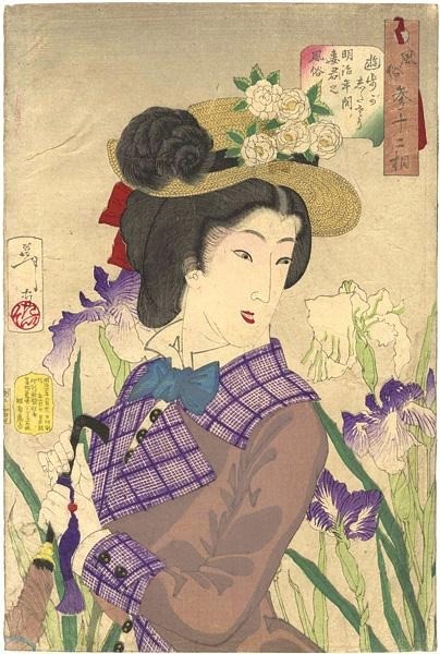 In terms of subject matter, another characteristic of Yoshitoshi's beauty portraiture is the incorporation of Western themes. In Yoshitoshi's beauty portraiture from the Meiji era following the Meiji Restoration, elements such as suits, umbrellas, and picture frames are woven in. The poses in these beauty portraits are photographic and realistic, reflecting the changes in lifestyle resulting from urbanization and the establishment of interactions with the Western world in Meiji society.